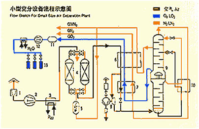 These series plants are producing the pure oxygen and nitrogen from the air with a method of medium pressure cycle and cryogenic refrigeration i. e. first produce the liquid air using the medium pressure reciprocating expansion engine, then in the cold box, the liquid air is rectificated into gas oxygen with a purity of 99.5% and gas nitrogen with q purity of 99.99% by means of their different boiling point. These plants also can produce a bit of liquid oxygen and nitrogen, and medical oxygen after changing some parts, if any.
